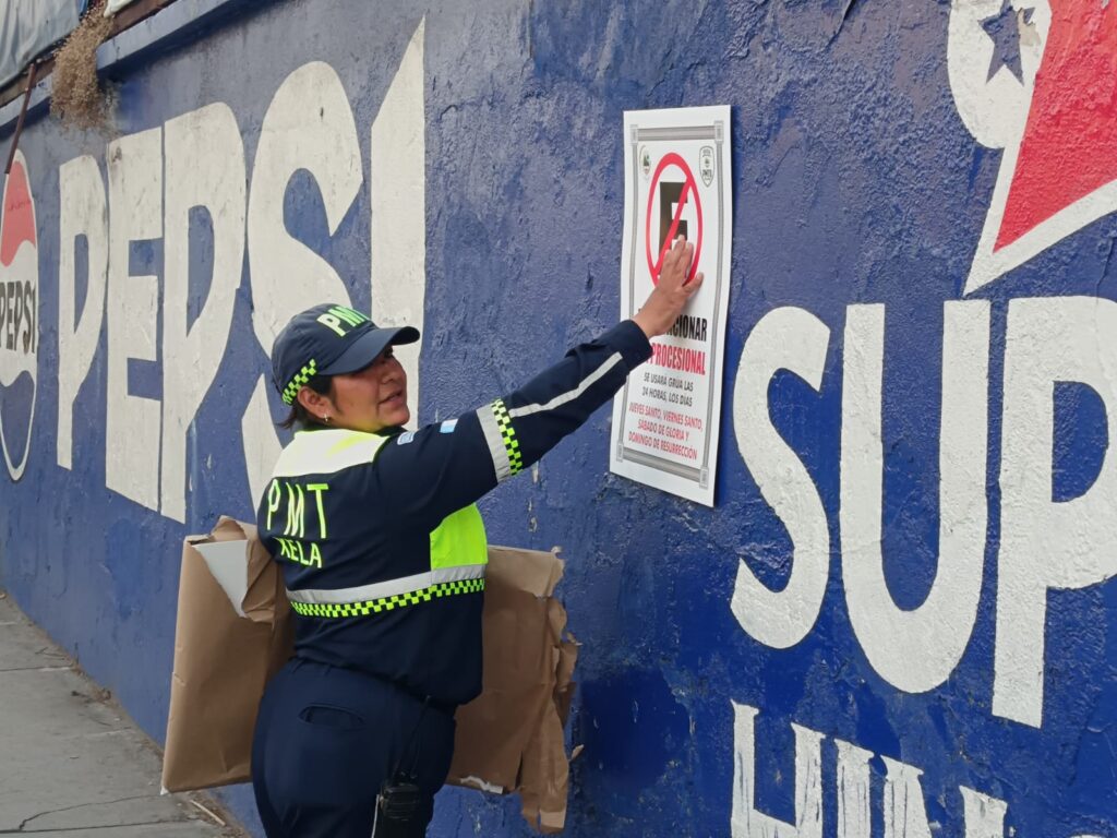Este Miércoles Santo, agentes de la Policía Municipal de Tránsito de Quetzaltenango (PMTQ) continúan la colocación de afiches por el paso de cortejos procesionales por Semana Santa.