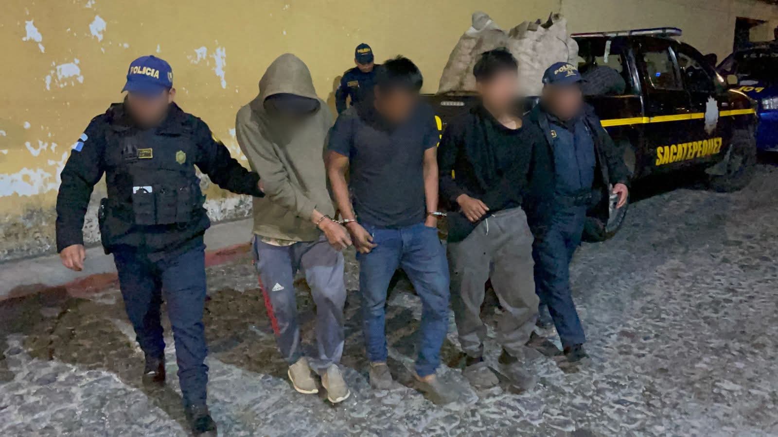 Este lunes, en redes sociales, la Policía Nacional Civil (PNC) informa de la detención de tres presuntos integrantes de la banda de saqueadores «Los Jutes», en el kilómetro 85.5, San Juan Alotenango, Sacatepéquez.