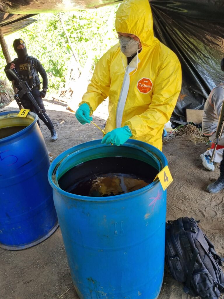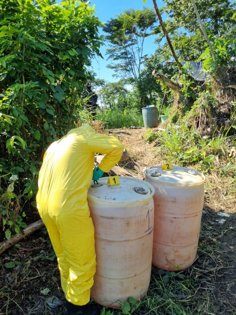 «En el lugar se localizaron 6 toneles con hoja de coca, triturada, 6 toneles con gasolina, 3 sacos de sulfato de amoniaco, 2 sacos de cal y una máquina trituradora», informa la publicación de la PNC.