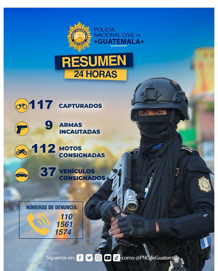 En las últimas 24 horas, agentes de la Policía Nacional Civil (PNC) reportan la captura de 117 personas en distintos operativos desarrollados a nivel nacional.