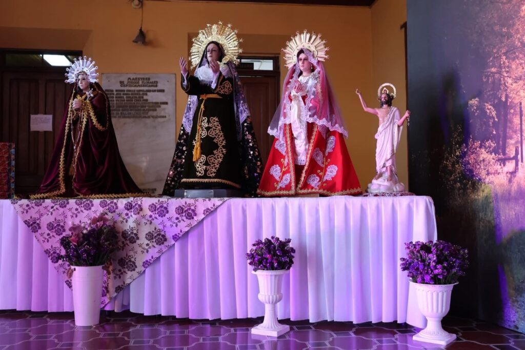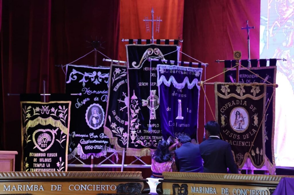 En el foyer del teatro se desarrolla la veneración de réplicas de distintas hermandades, brindando a los asistentes una experiencia cultural y espiritual que fortalece la identidad quetzalteca.