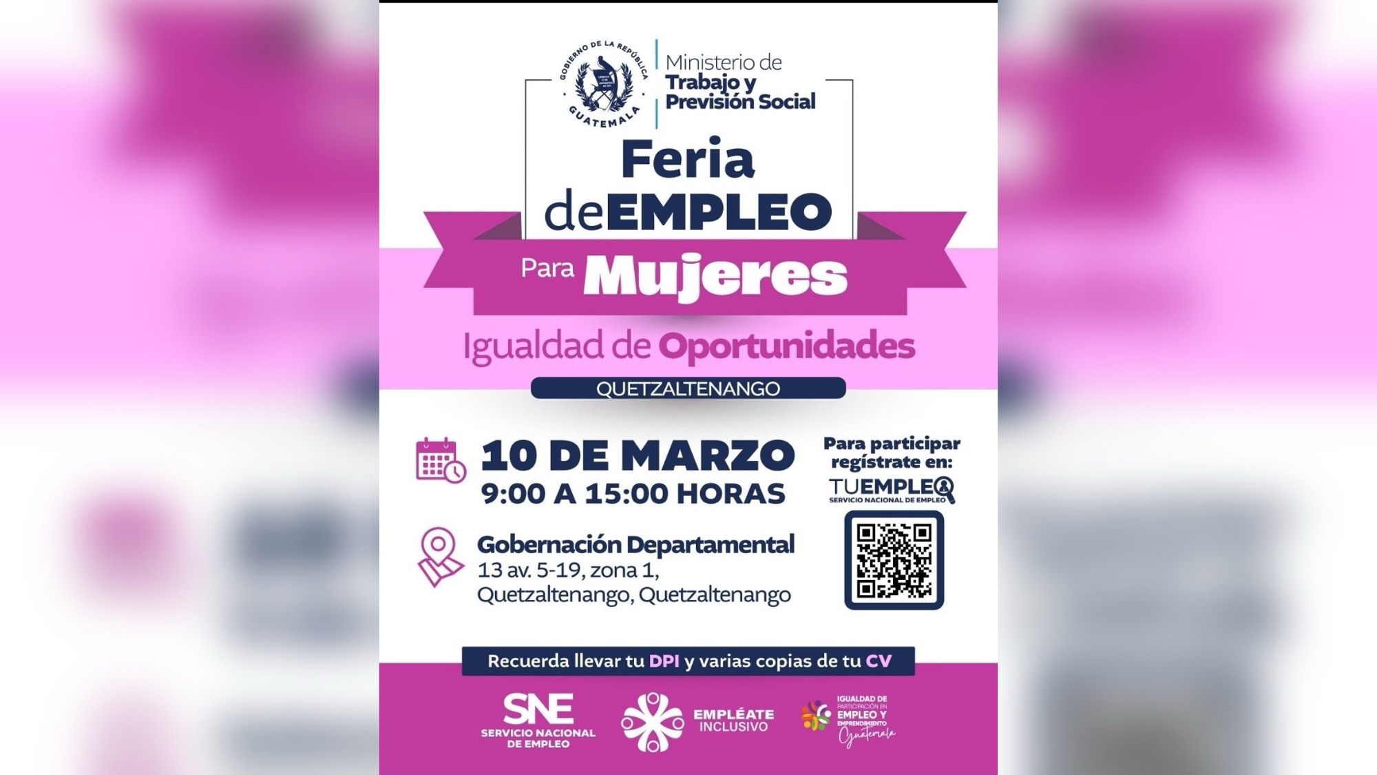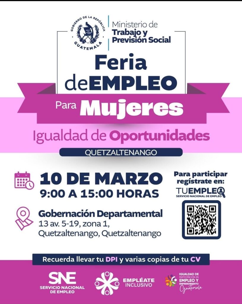 El Ministerio de Trabajo y Previsión Social realizará este 10 de marzo, de 9:00 a 15:00 horas, una feria de empleo dirigida a mujeres en las instalaciones de la Gobernación Departamental de Quetzaltenango.