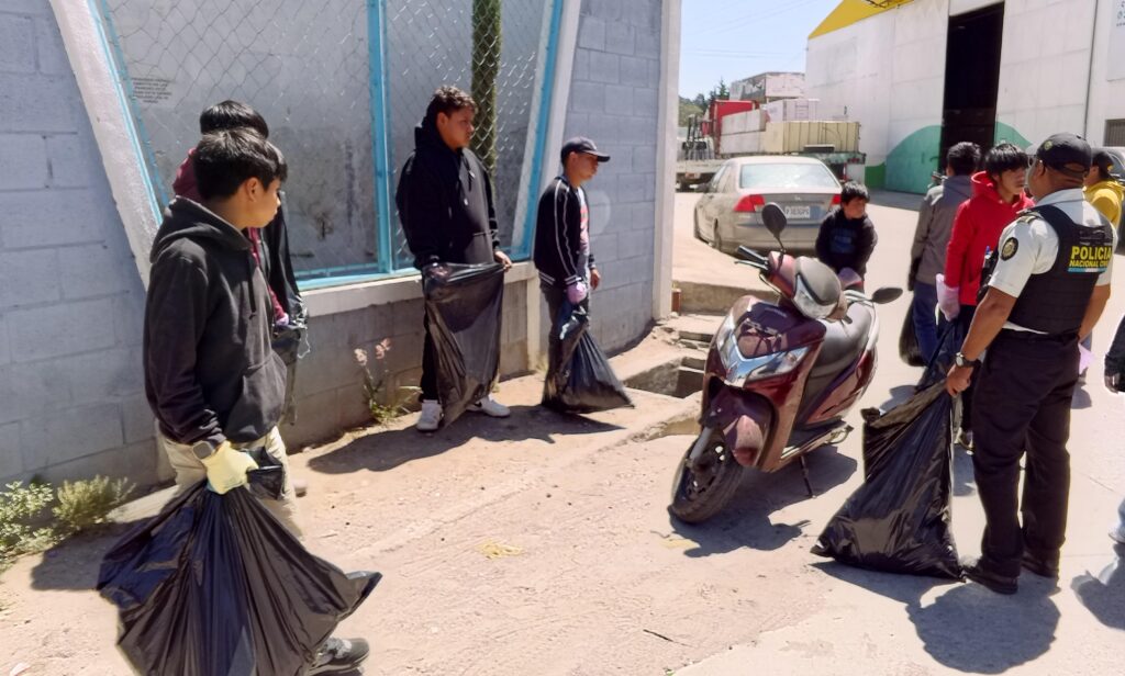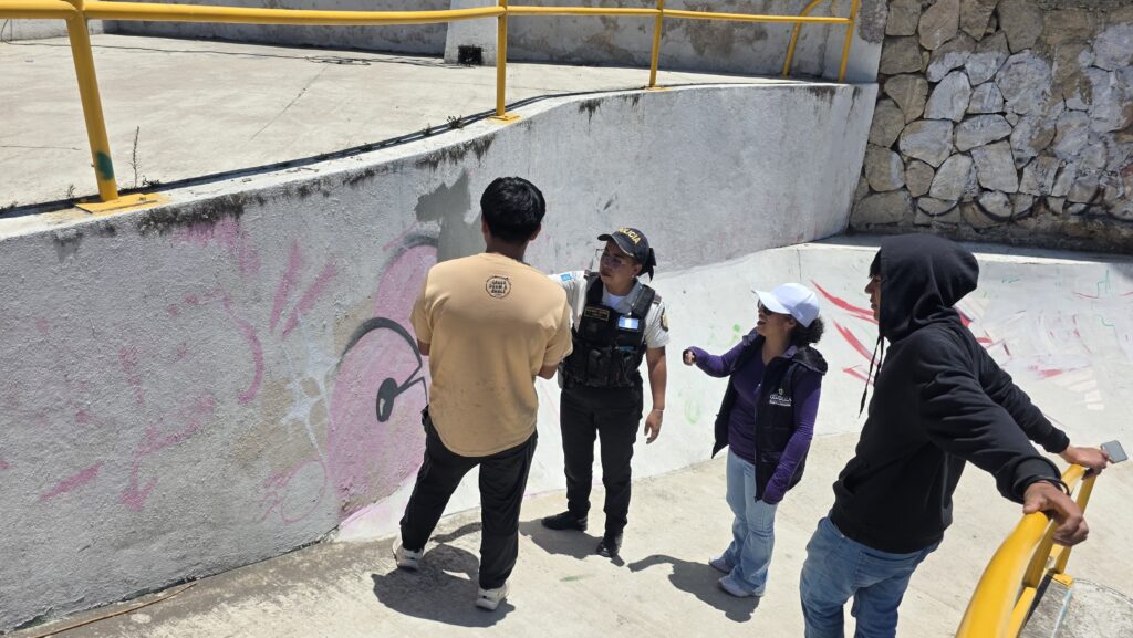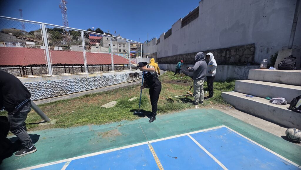 Personal de la Delegación de Intervención de Relaciones Comunitarias de la Comisaría 41 de la PNC, en coordinación con Luz María Barrios, trabajadora social de la Secretaría de Bienestar Social, recuperan espacios públicos.