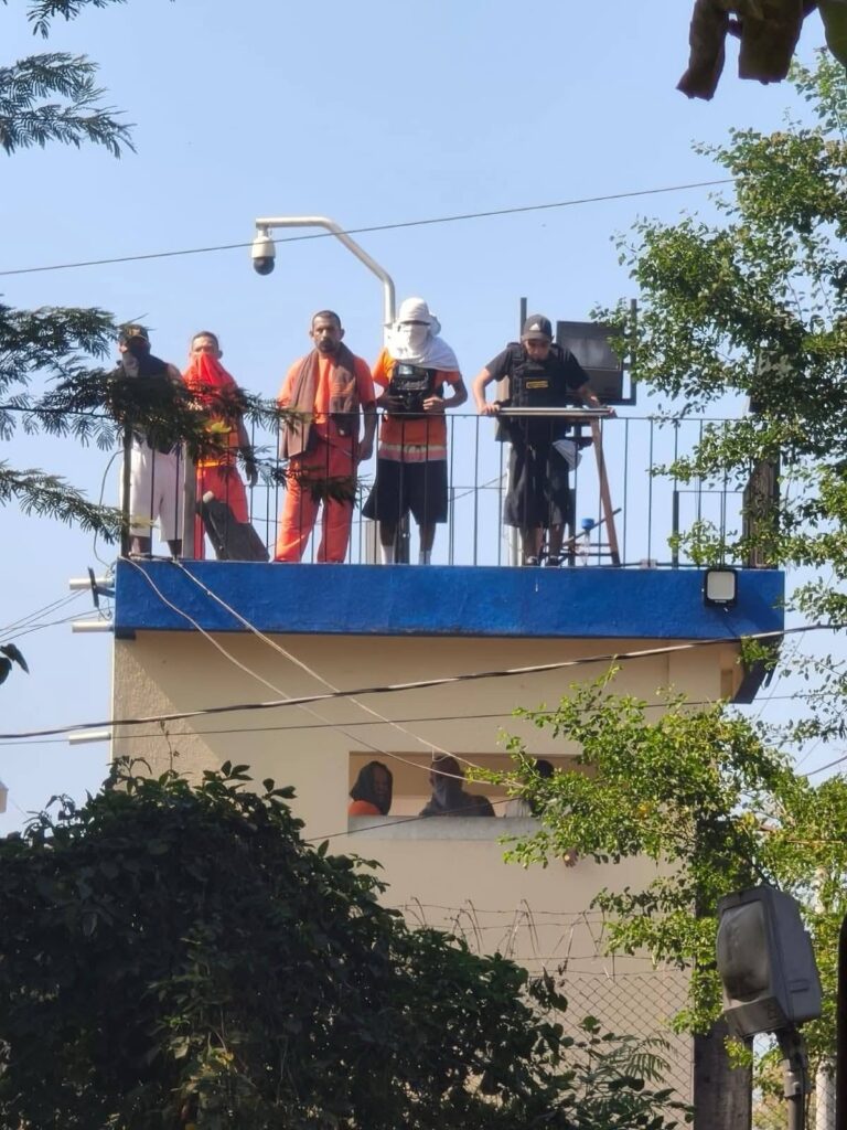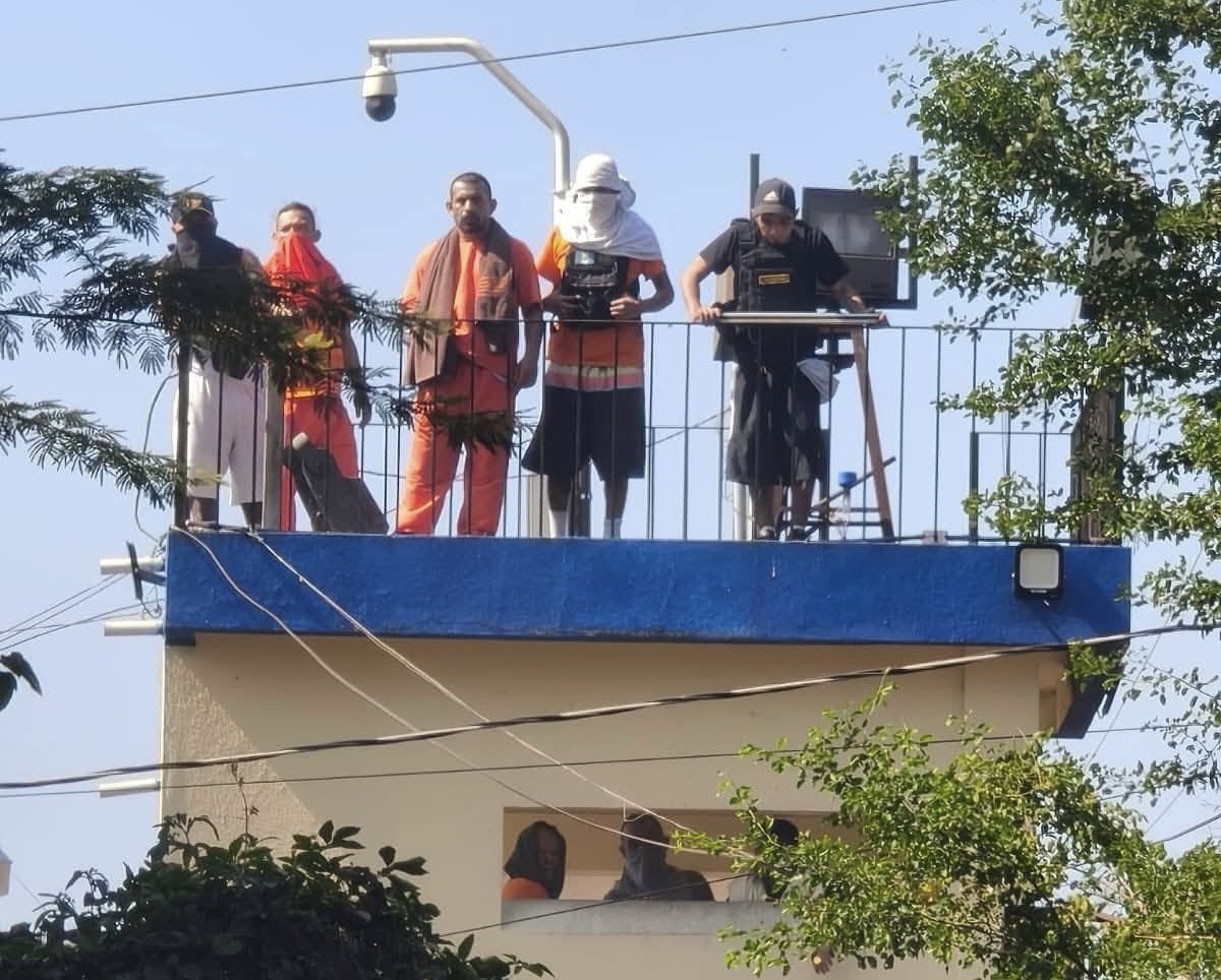 Desde el exterior se observa a reclusos ubicados en las torres de vigilancia, desde donde amenazan y desafían a las fuerzas de seguridad, lo que evidencia el nivel de descontrol generado por el motín.