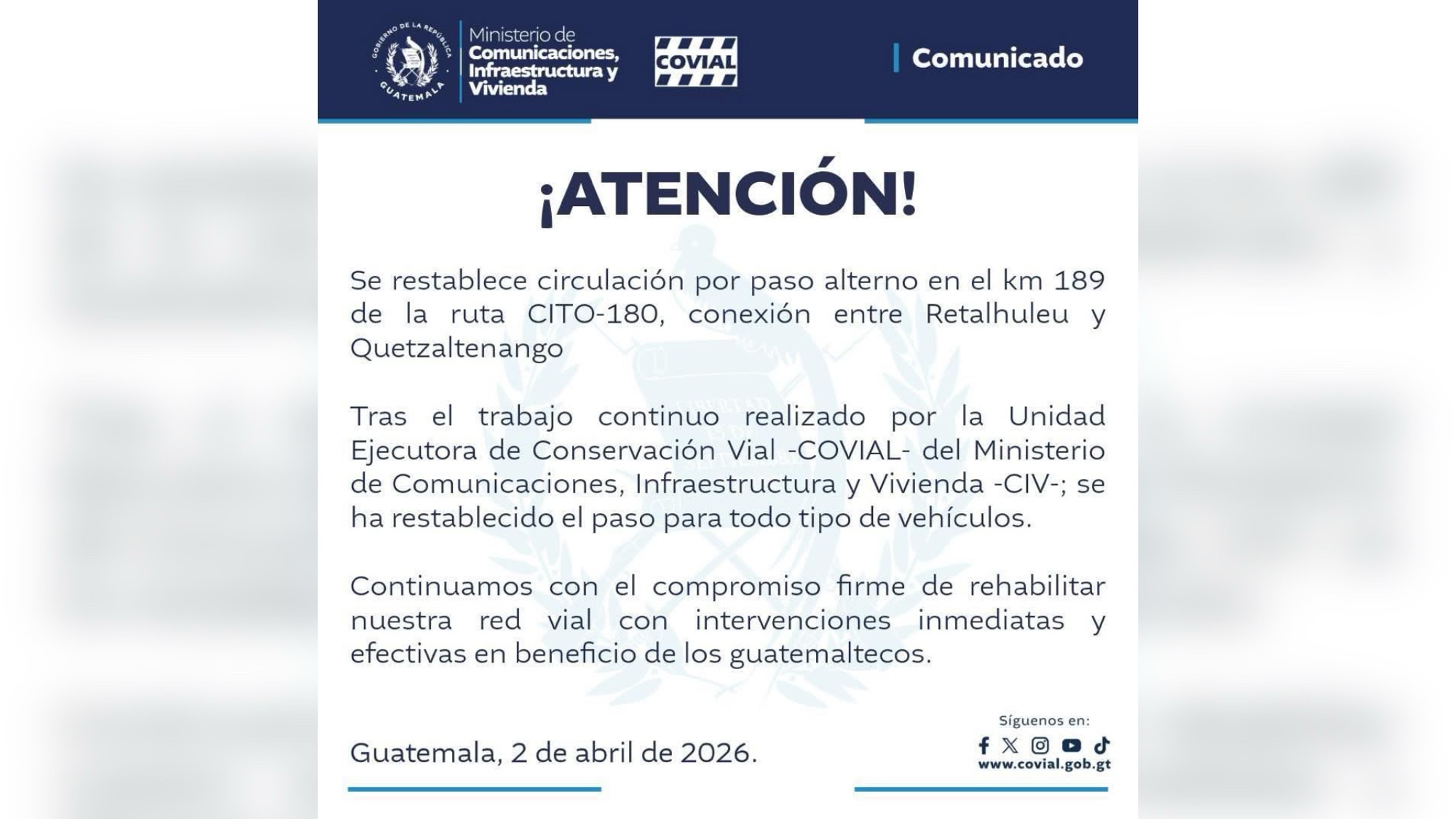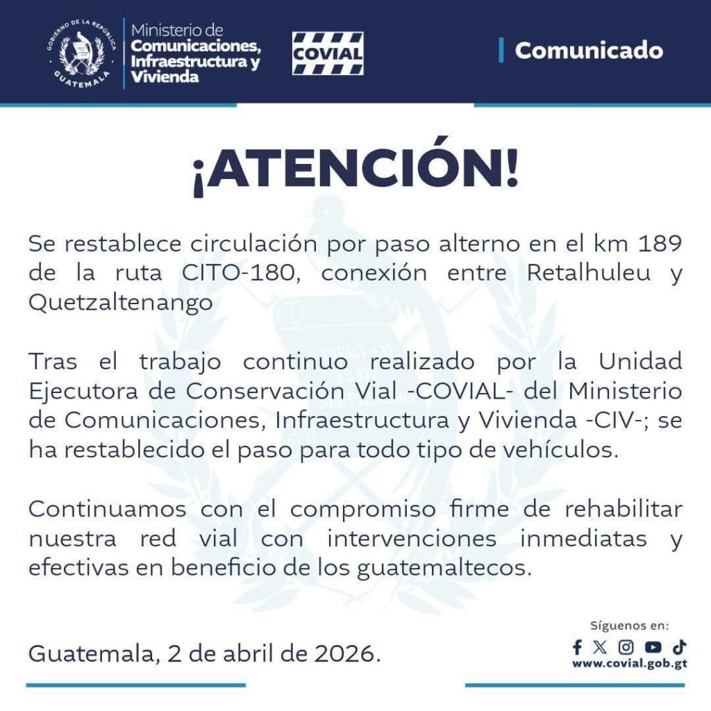 ZUNIL, QUETZALTENANGO — La conectividad entre Retalhuleu y Quetzaltenango ha recuperado su fluidez. El Ministerio de Comunicaciones, Infraestructura y Vivienda (CIV), a través de la Unidad Ejecutora de Conservación Vial (COVIAL), confirmó este jueves que los trabajos de recuperación en el kilómetro 189 de la ruta CITO-180 han finalizado con éxito, permitiendo la reactivación del flujo vehicular.