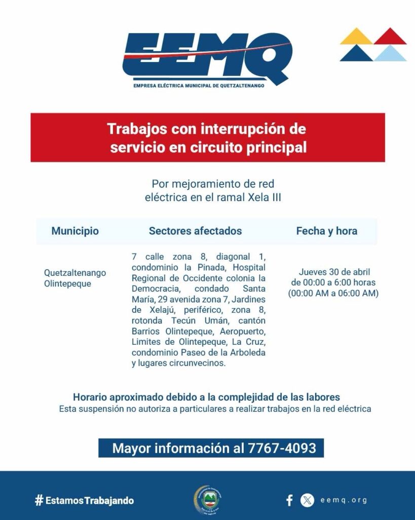Estas labores corresponden al mejoramiento de la red eléctrica en el circuito principal, que inició durante la madrugada de este jueves 30 de abril, afectando sectores de los municipios de Quetzaltenango y Olintepeque.