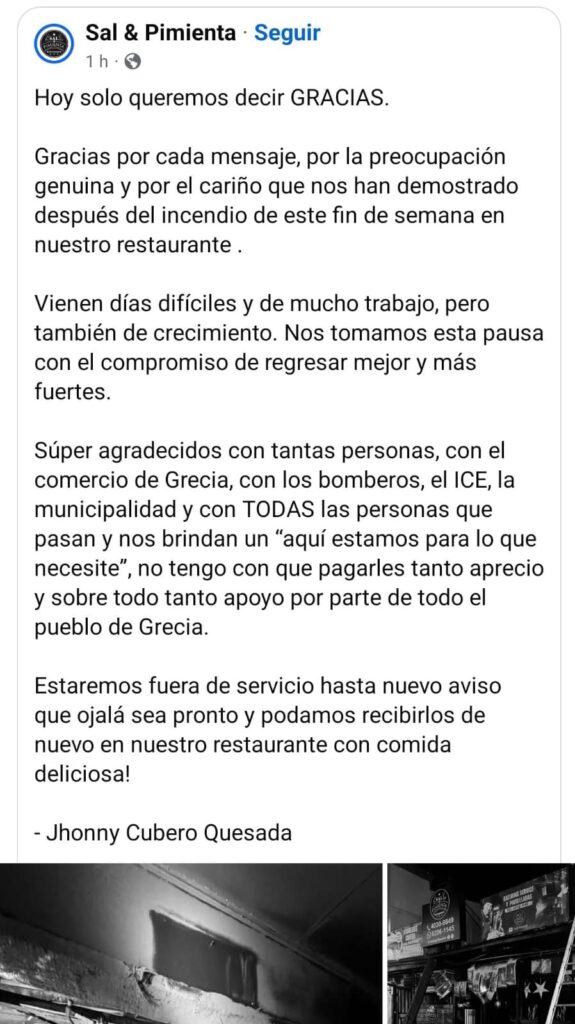 «Gracias por cada mensaje, por la preocupación genuina y por el cariño que nos han demostrado después del incendio de este fin de semana en nuestro restaurante.