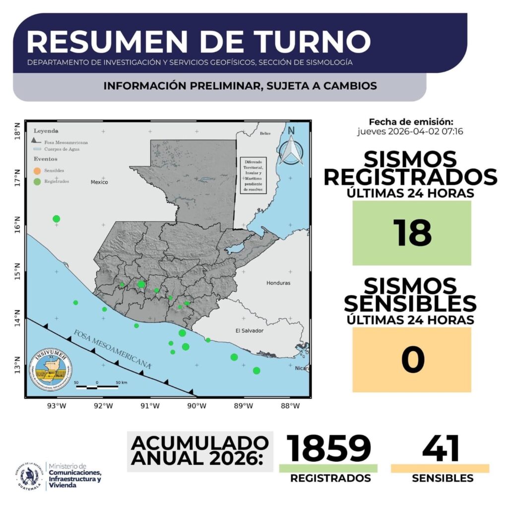 El Instituto Nacional de Sismología, Vulcanología, Meteorología e Hidrología (INSIVUMEH) emitió informe, mientras continúa con el monitoreo y análisis del evento sísmico.