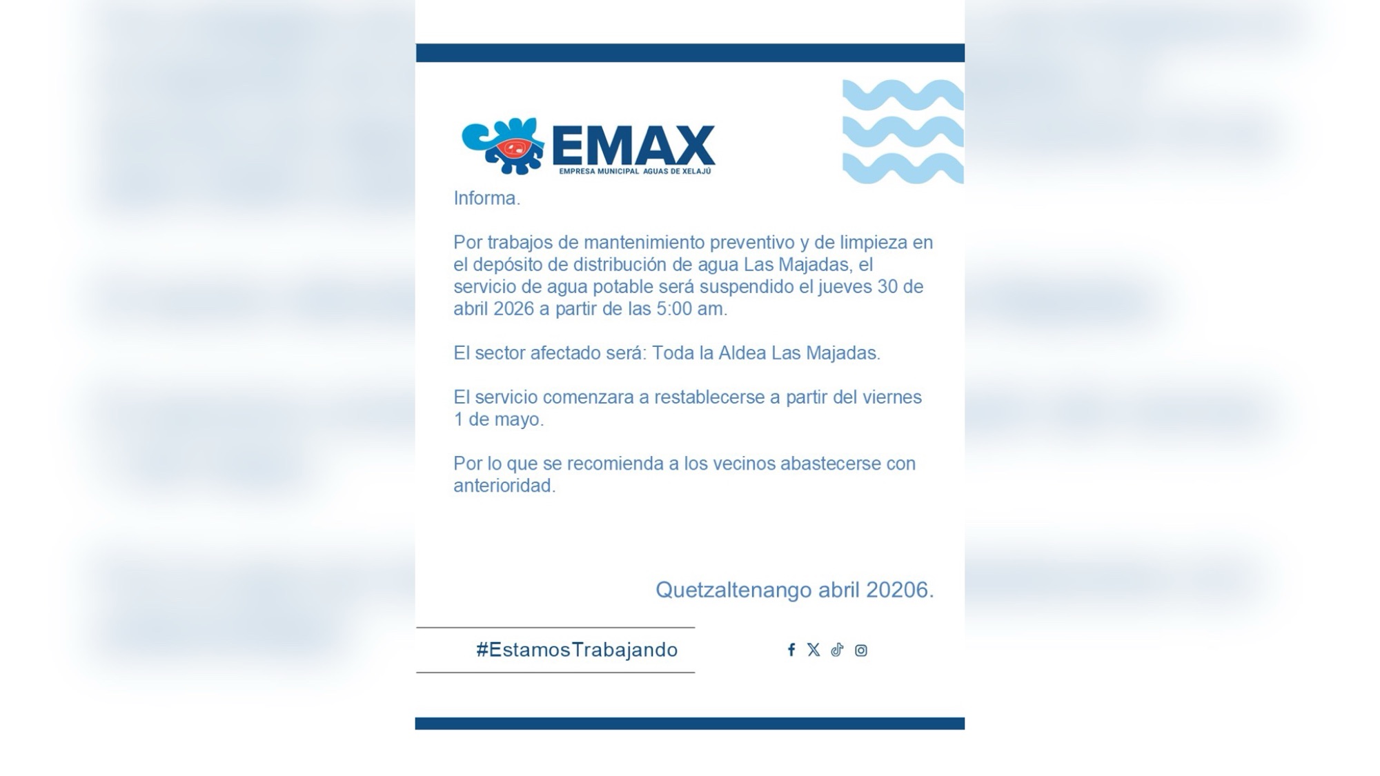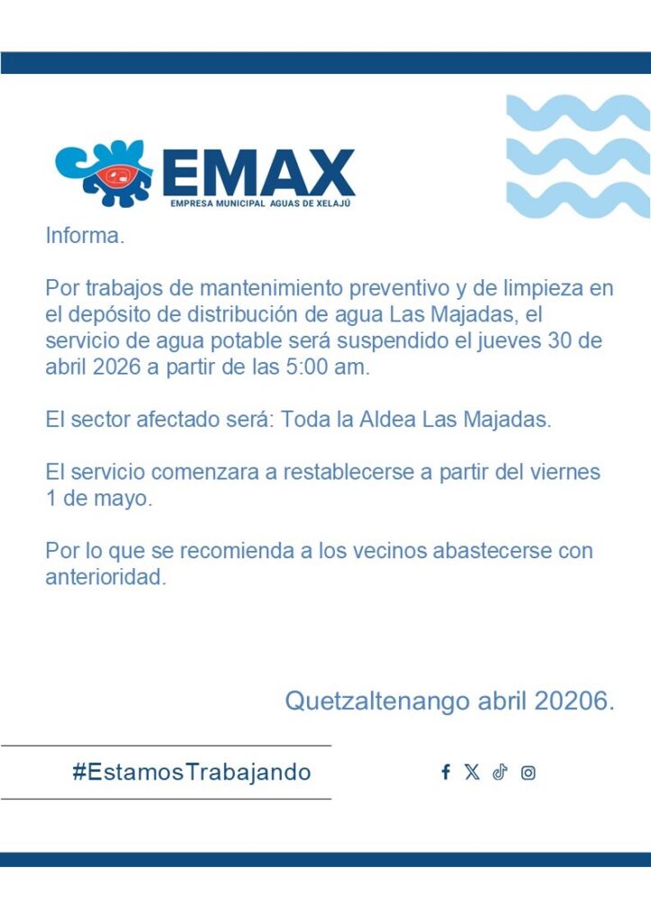 La Empresa Municipal Aguas de Xelajú (EMAX) informó que el servicio de agua potable será suspendido este jueves 30 de abril en la aldea Las Majadas, en Quetzaltenango.