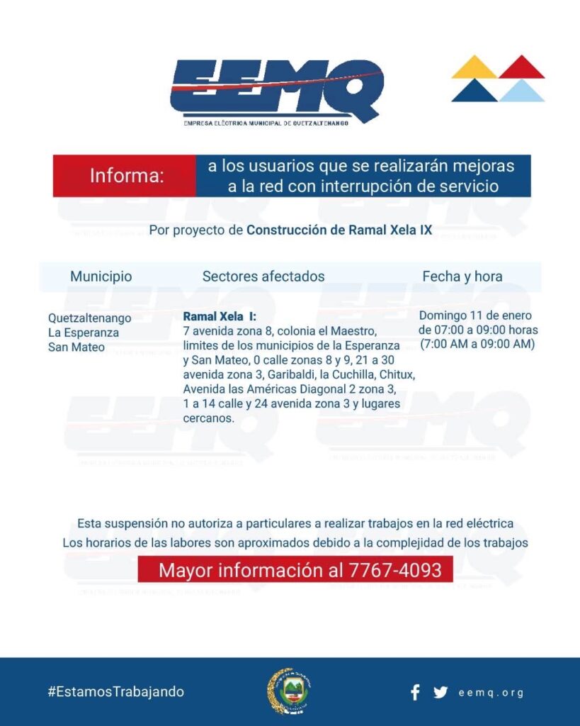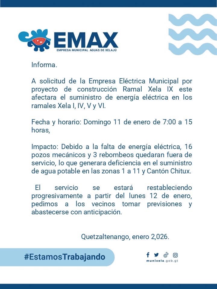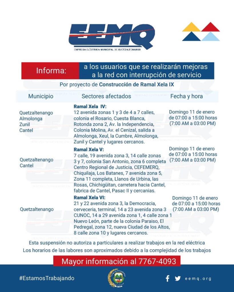 La Empresa Eléctrica Municipal de Quetzaltenango (EEMQ) y EMAX informaron que este domingo 11 de enero se realizará una suspensión programada de energía eléctrica debido al avance del proyecto de construcción del ramal de distribución Xela IX, trabajos que impactarán directamente los ramales Xela I, IV, V y VI.