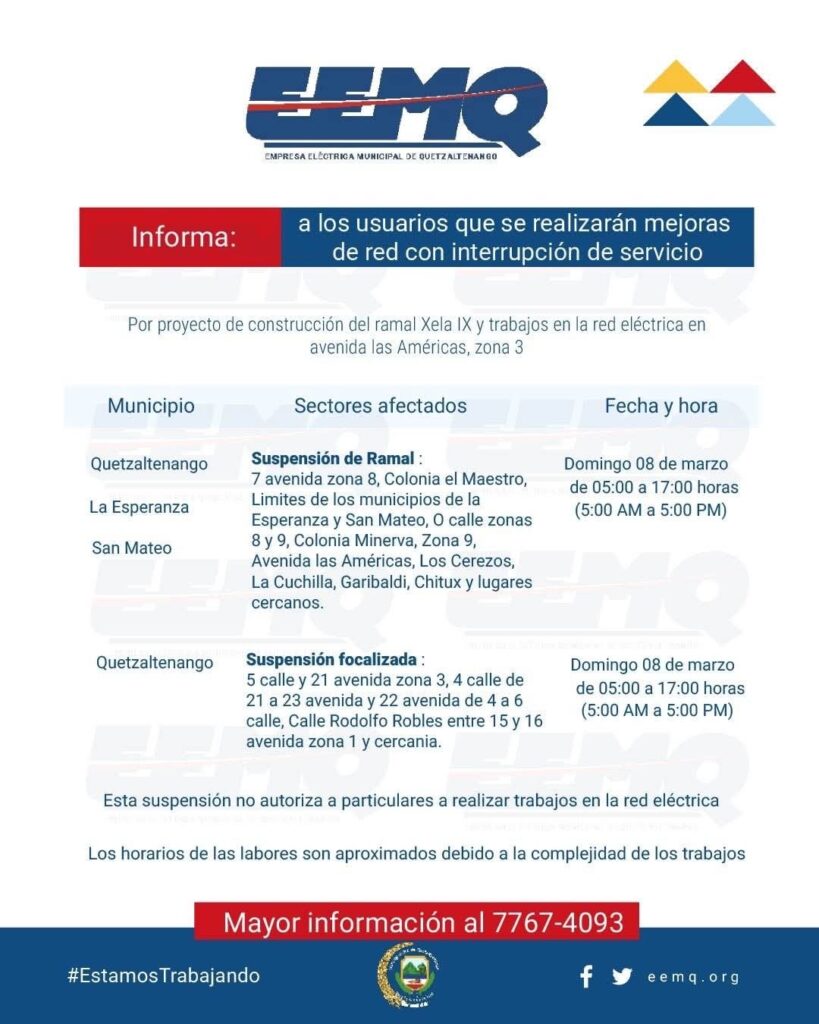 La Empresa Eléctrica Municipal de Quetzaltenango (EEMQ) informó que este domingo se realizará una interrupción temporal del servicio de energía eléctrica en algunos sectores de la ciudad, debido a trabajos de construcción y mantenimiento en la red.