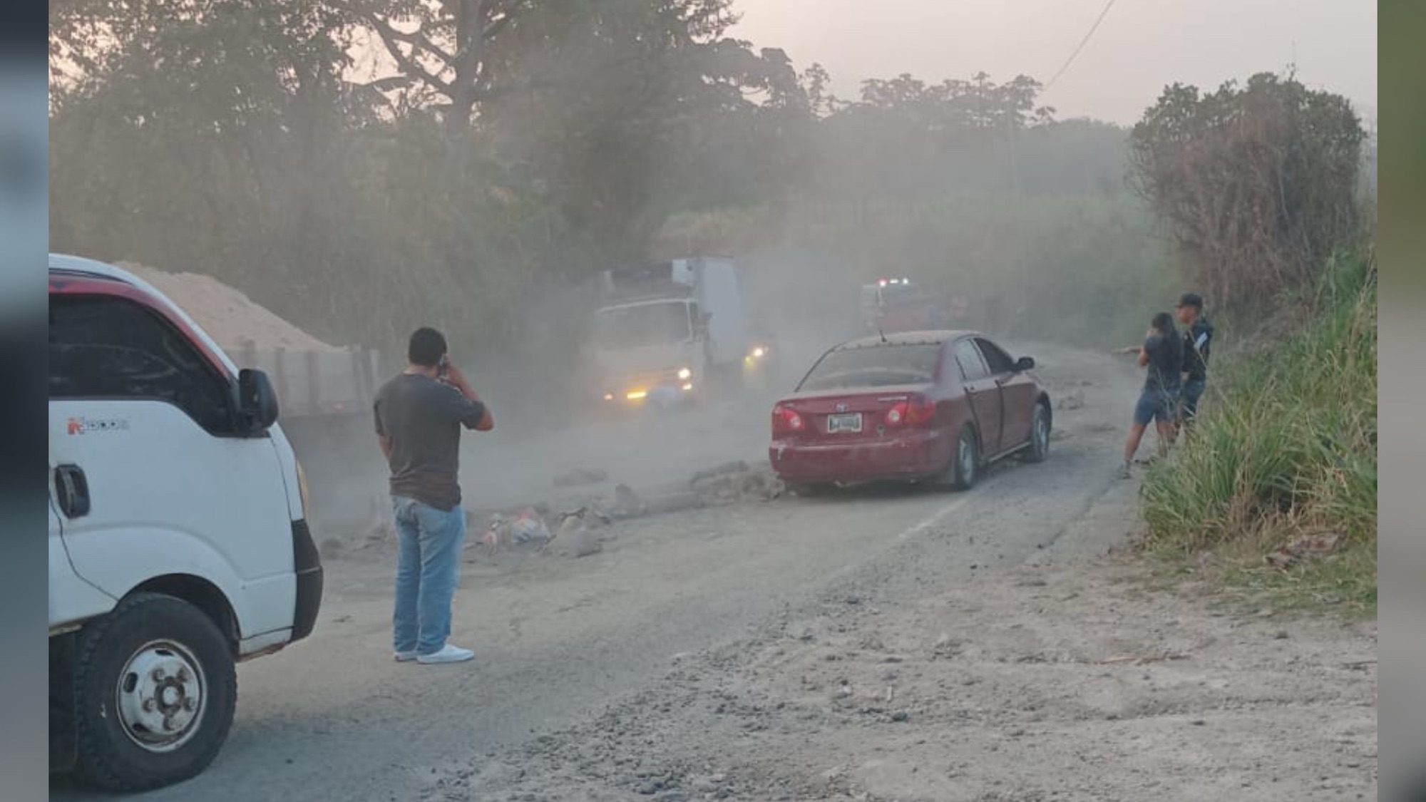 Según la información preliminar, un vehículo de transporte pesado tipo tráiler, que trasladaba aproximadamente 500 quintales de cemento, sufrió un percance cuando la carga se descontroló y cayó sobre la cinta asfáltica, obstruyendo ambos carriles.