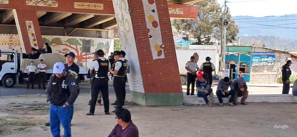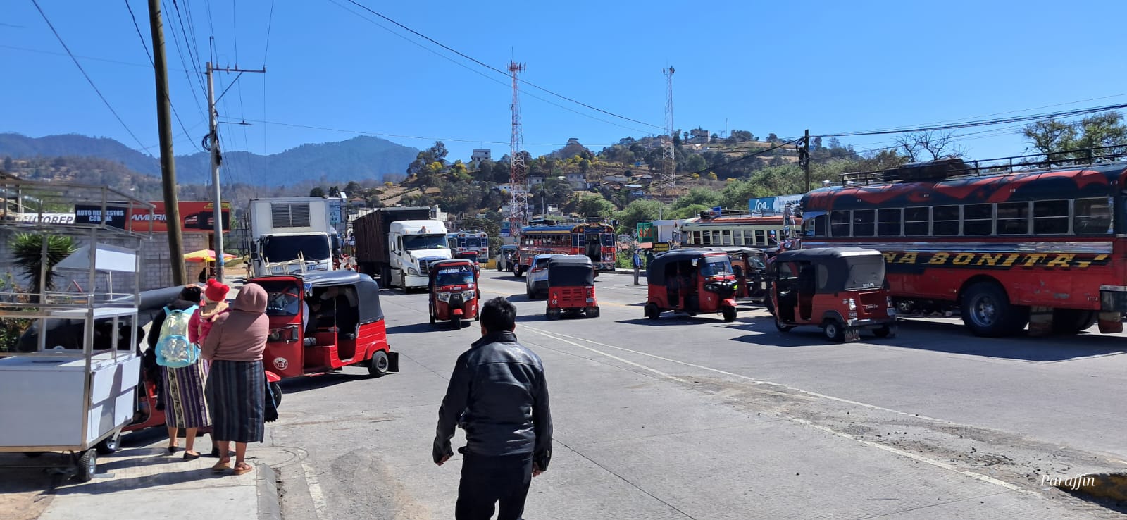 Transportistas bloquean este martes en Cuatro Caminos, San Cristóbal, Totonicapán.