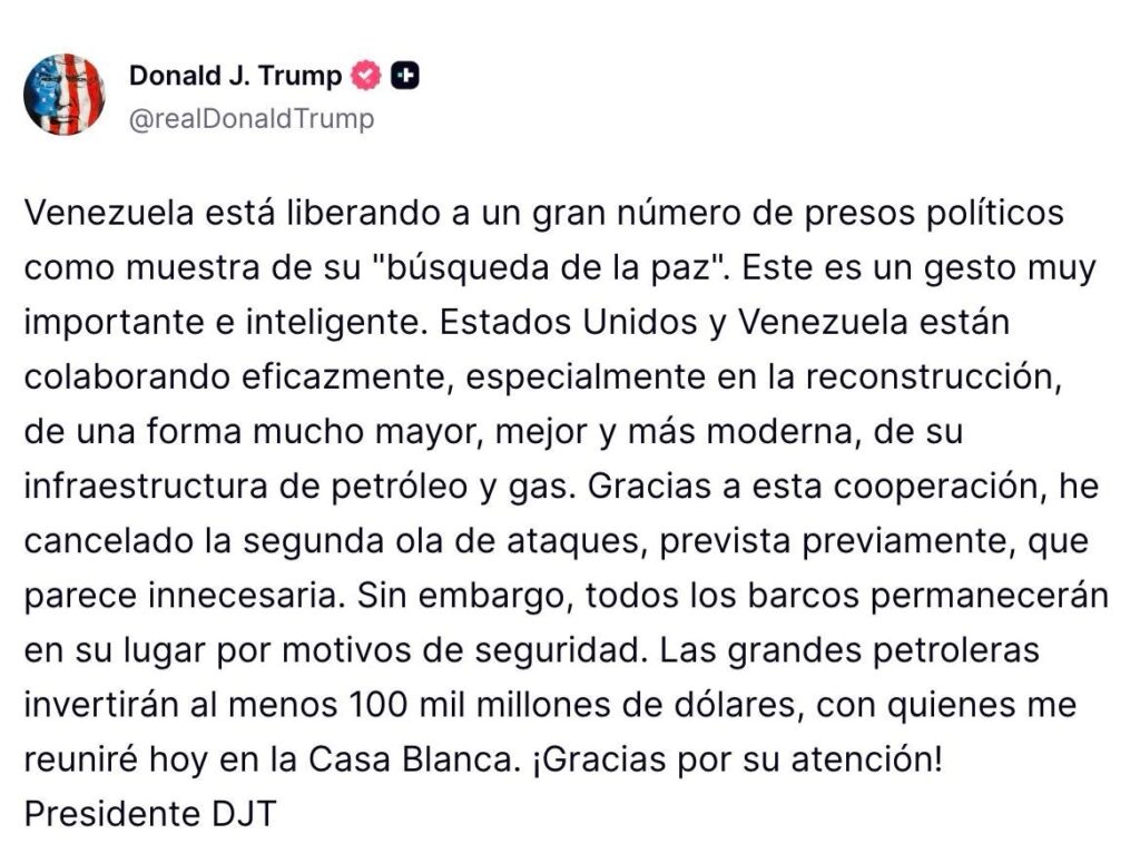 Según el propio mandatario, expresado en su plataforma de redes sociales, el anuncio se da en un contexto en que Venezuela ha comenzado a liberar un “gran número de presos políticos”, lo cual calificó como un “gesto importante e inteligente” encaminado a buscar la paz y facilitar la cooperación bilateral.