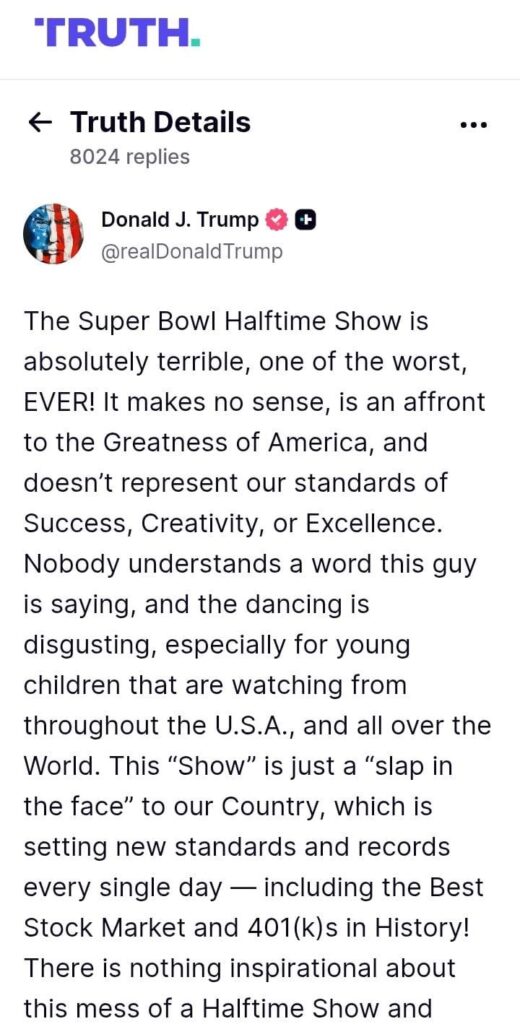 Tras la histórica presentación de Bad Bunny en el espectáculo de medio tiempo del Super Bowl LX, el presidente de Estados Unidos, Donald Trump, arremetió contra el show ofreciendo una crítica pública en su red social Truth Social.