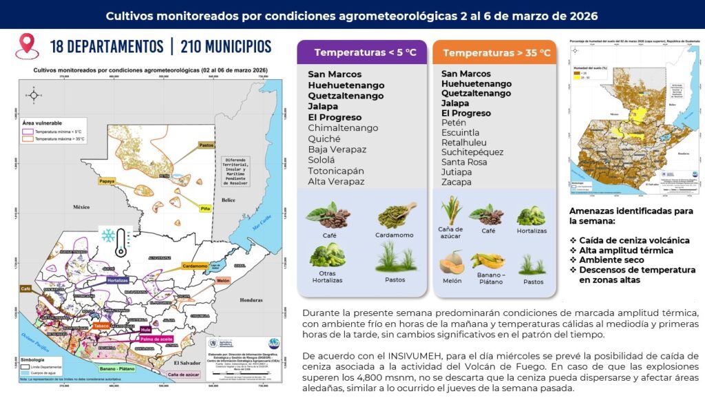 El análisis agrometeorológico semanal alerta por caída de ceniza volcánica, alta amplitud térmica, descensos de temperatura en zonas altas y ambientes secos, condiciones que pueden afectar la producción agrícola y pecuaria en al menos 18 departamentos y 210 municipios de Guatemala.