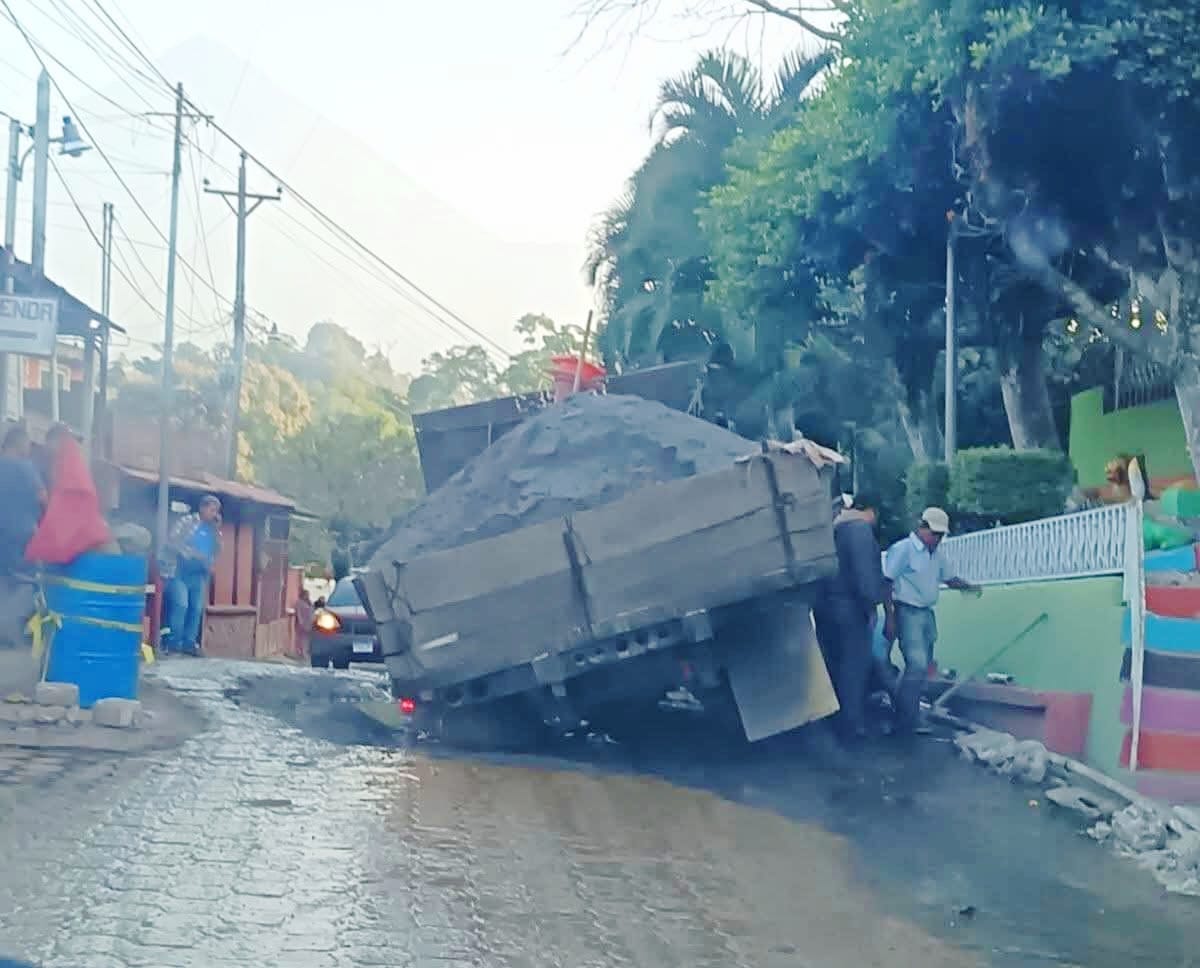 En el video se observa cuando un camión, el cual iba cargado de arena, quedó varado en uno de los agujeros de la calle. Los pobladores piden a las autoridades gubernamentales tomar cartas en este asunto.