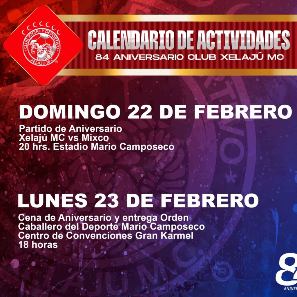 El CSD Xelajú MC dio a conocer la agenda oficial de actividades conmemorativas por su 84 aniversario, invitando a su afición, socios, medios de comunicación y comunidad deportiva a sumarse a las distintas celebraciones que honran la historia y legado de la institución altense.